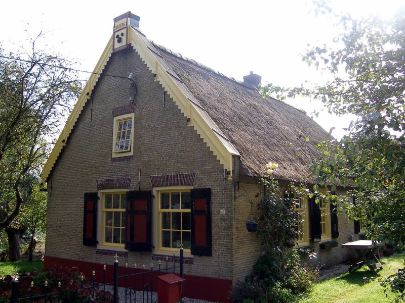 Boerderij, onder met riet gedekt wolfdak, dat woonhuis en stal overdekt. Westeinde 13